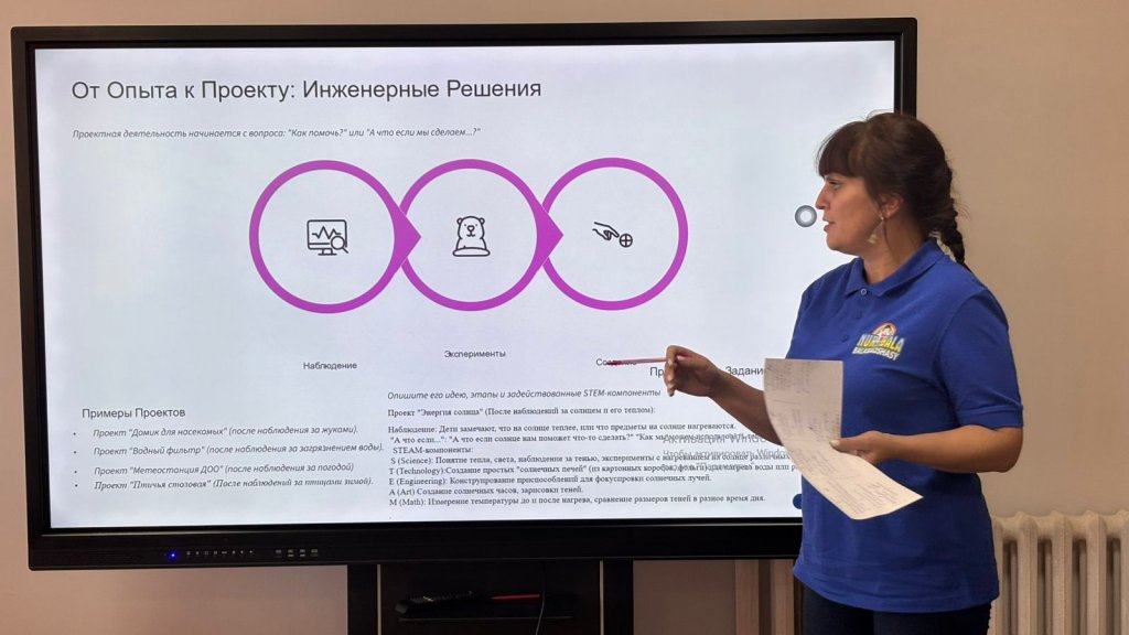 Не істелді: балабақшадағы STEM бағытының рөлі талқыланды, қарапайым тәжірибелер мен бақылаулар пысықталып өтті, педагогтар командалық жұмыс түрінде жобалық қызмет жоспарлап,презентациясын жасады. ( жобалар: «Жәндіктерге арналған үйлер», «Метеостанция», «Су сүзгісі», «Күн энергиясы»). Тәрбиешілер дайын сценарийлер мен тәжірибеге енгізуге арналған «идеялар қоржынын» алды.