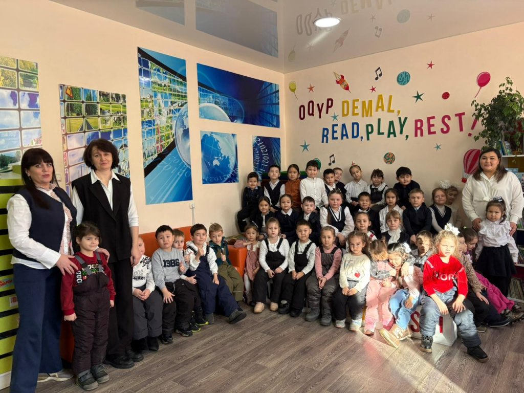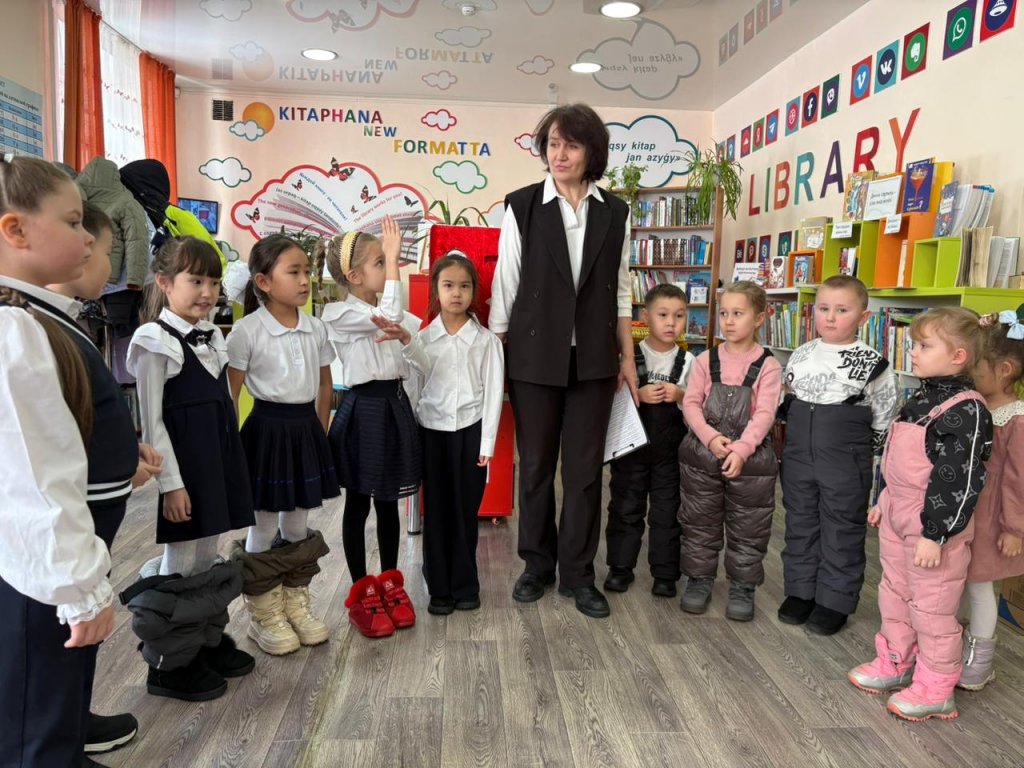 Балабақша мен мектеп арасындағы сабақтастық аясында біздің болашақ бірінші сынып оқушылары мектеп оқушыларымен бірге кітапханаға экскурсияға барды. Кездесудің мақсаты — балаларға оқу қызықты әрі кітап — нағыз әрі адал дос екенін көрсету.Балалар кітапханамен танысты, көптеген жаңа мәліметтер білді, қызығушылықпен әңгімелер тыңдап, кітаптарды қуана қарасты.